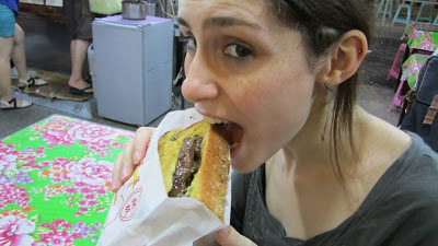 | Esse é chamado de "torrada caixão", porque eles abrem um buraco na torrada e colocam o recheio que você escolher (esse é de carne)! |